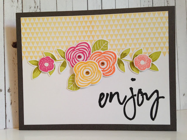 This card is so colorful and cheerful! The leaves are adhered flat to the card and the flowers are attached with 3D adhesive. I added dark veins to the frond with a Copic marker.